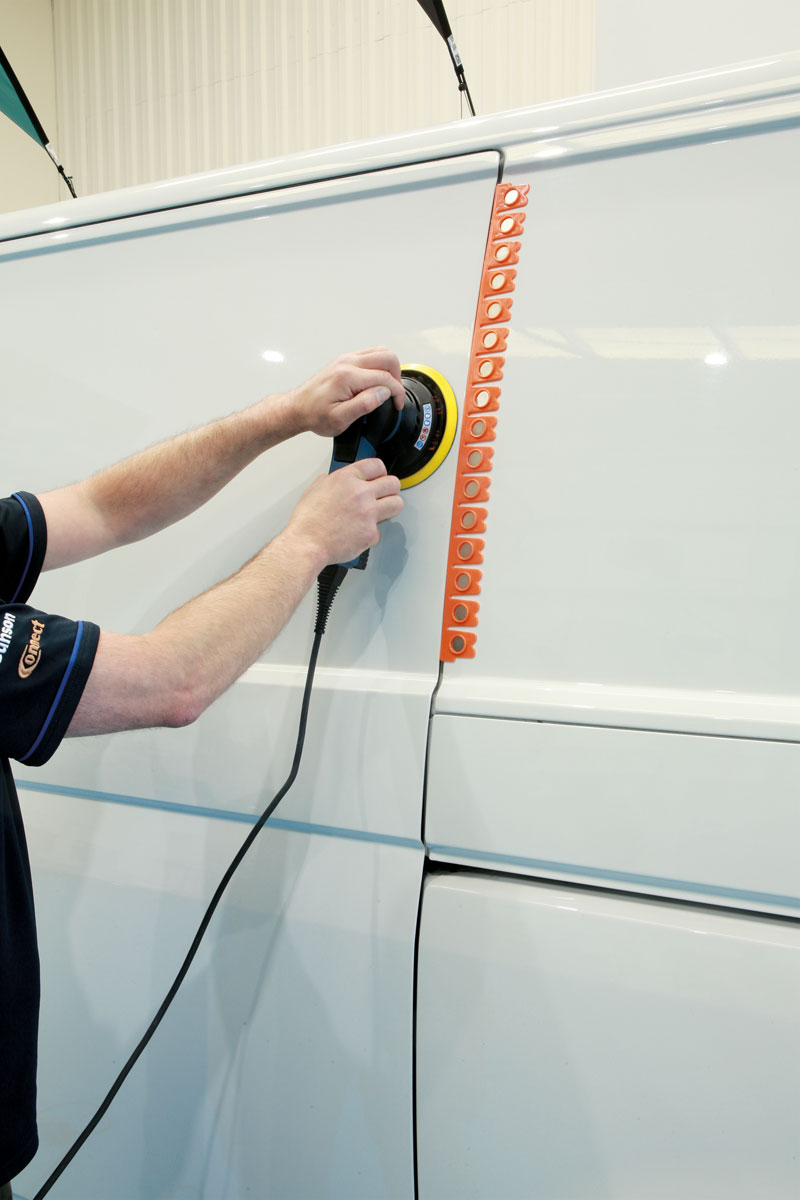 It’s easily done — a slip of the DA sander and the adjacent panel gets marked — now you’ve got to refinish that panel as well! The flexible nylon strip hooks over the edge of the panel to be protected, and is held securely by the 16 built-in magnets, providing a robust physical and visual barrier that stops any accidental damage.