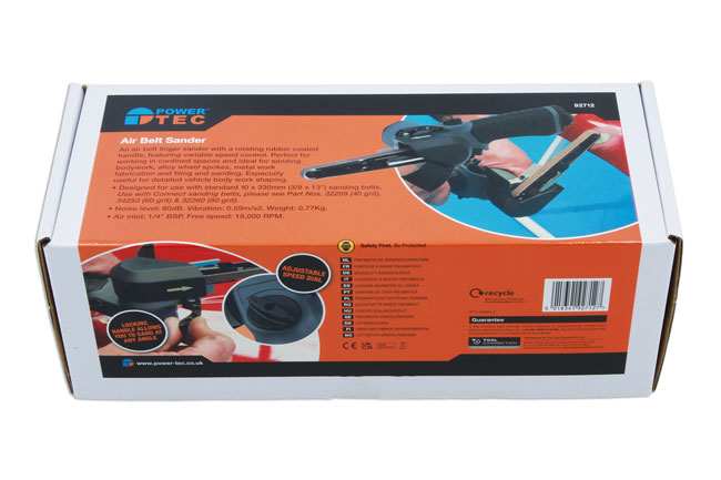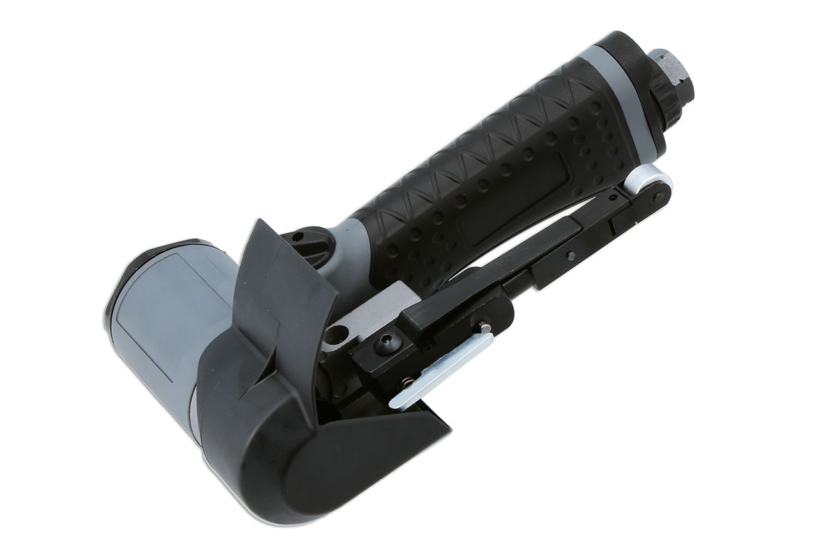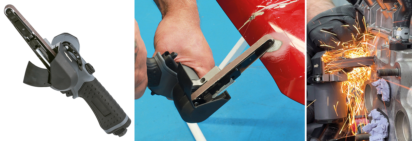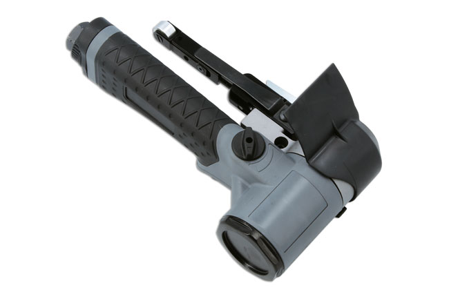 An air belt finger sander with a rotating rubber coated handle, featuring variable speed control, designed for use with 10mm x 330mm sanding belts. Perfect for working in confined spaces and ideal for sanding bodywork, alloy wheel spokes, metalwork fabrication and filing and Sanding. Especially useful for detailed vehicle body works shaping.