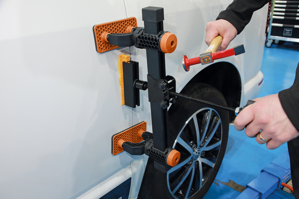Kit de débosselage par traction de type pont court, d'une longueur de 460 mm, avec un espace entre la surface de travail et le bas de la poutre de 120 mm, doté d'un levier réglable à commande manuelle, pour éliminer les bosses des panneaux de carrosserie et portières de véhicules. Permet de maintenir le panneau sous tension, ce qui facilite le travail de l'utilisateur en réduisant le nombre d'outils de débosselage, etc. Également doté de pieds entièrement rotatifs et réglables (plaques de traction), avec 40° de mouvement.