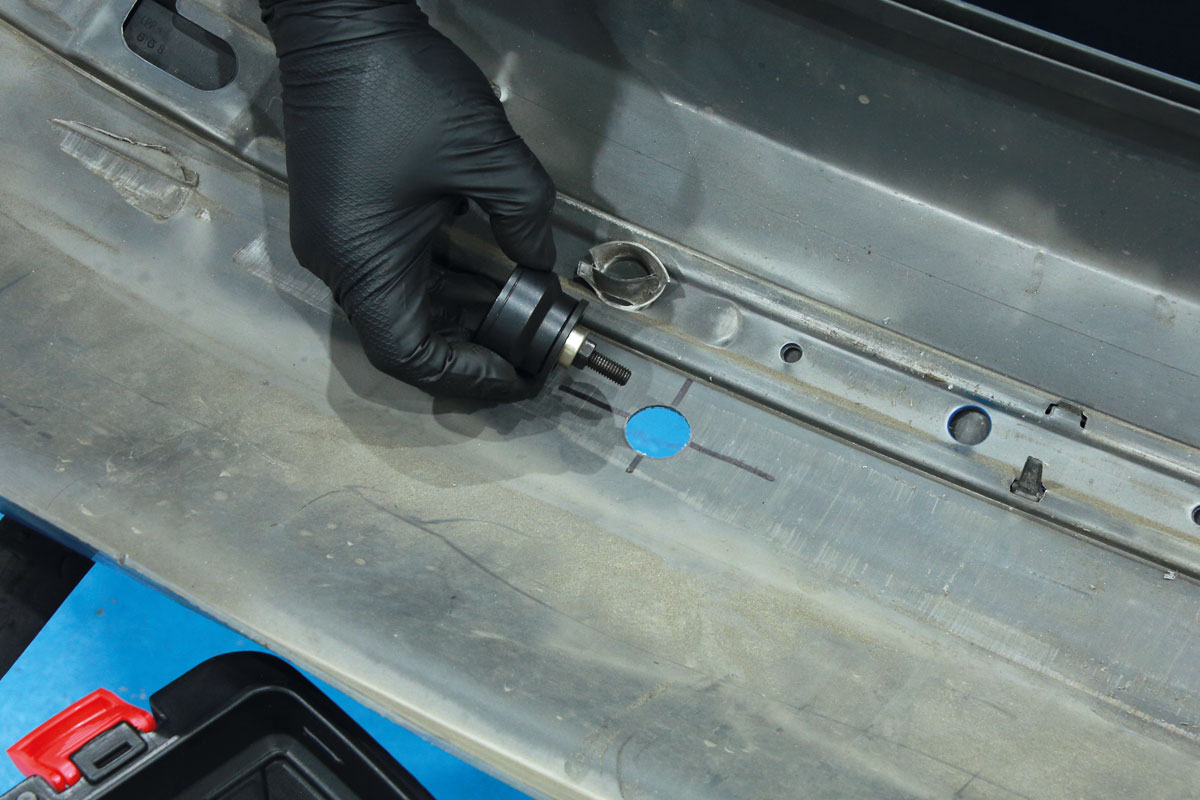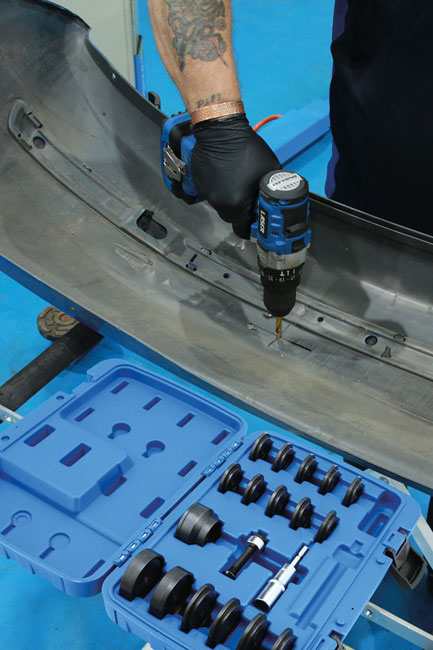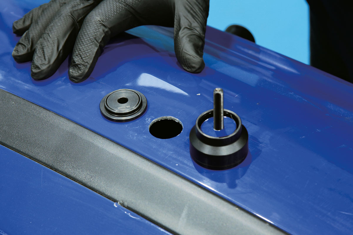 Umfassendes Lochstanzerset für Einparkhilfesensoren, um schnell präzise und saubere Löcher zu stanzen, wenn nach einem Unfall neue Einparkhilfesensoren eingebaut werden müssen.