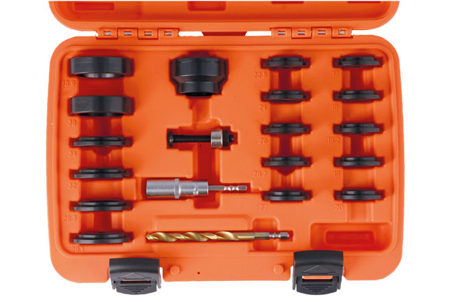 The set contains 16 common PDC hole sizes and the accessories a technician needs to produce manufacturer-standard holes in replacement bumper panels. Designed for use with cordless drills (not air tools), the kit delivers repeatable, burr-free cuts in plastic up to 5 mm thick and is supplied in a protective blow-moulded case for neat, secure storage.