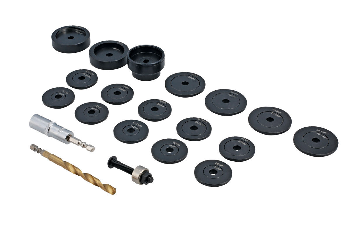 - Hole cutter sizes: 17, 18, 18.2, 19, 20, 22.5, 24, 26, 26.7, 27, 28.1, 29.3, 32, 34, 38 & 38.9mm.