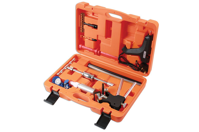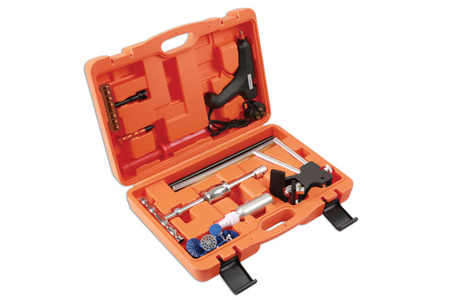 A comprehensive dent removal glue kit, ideal for reducing small dents, providing three methods of pulling dents: T-bar slide hammer for deeper dents; hand-operated easy puller for smaller dents and offers more control for finishing a dent; simple hand puller for shallow dents and final dent finishing.