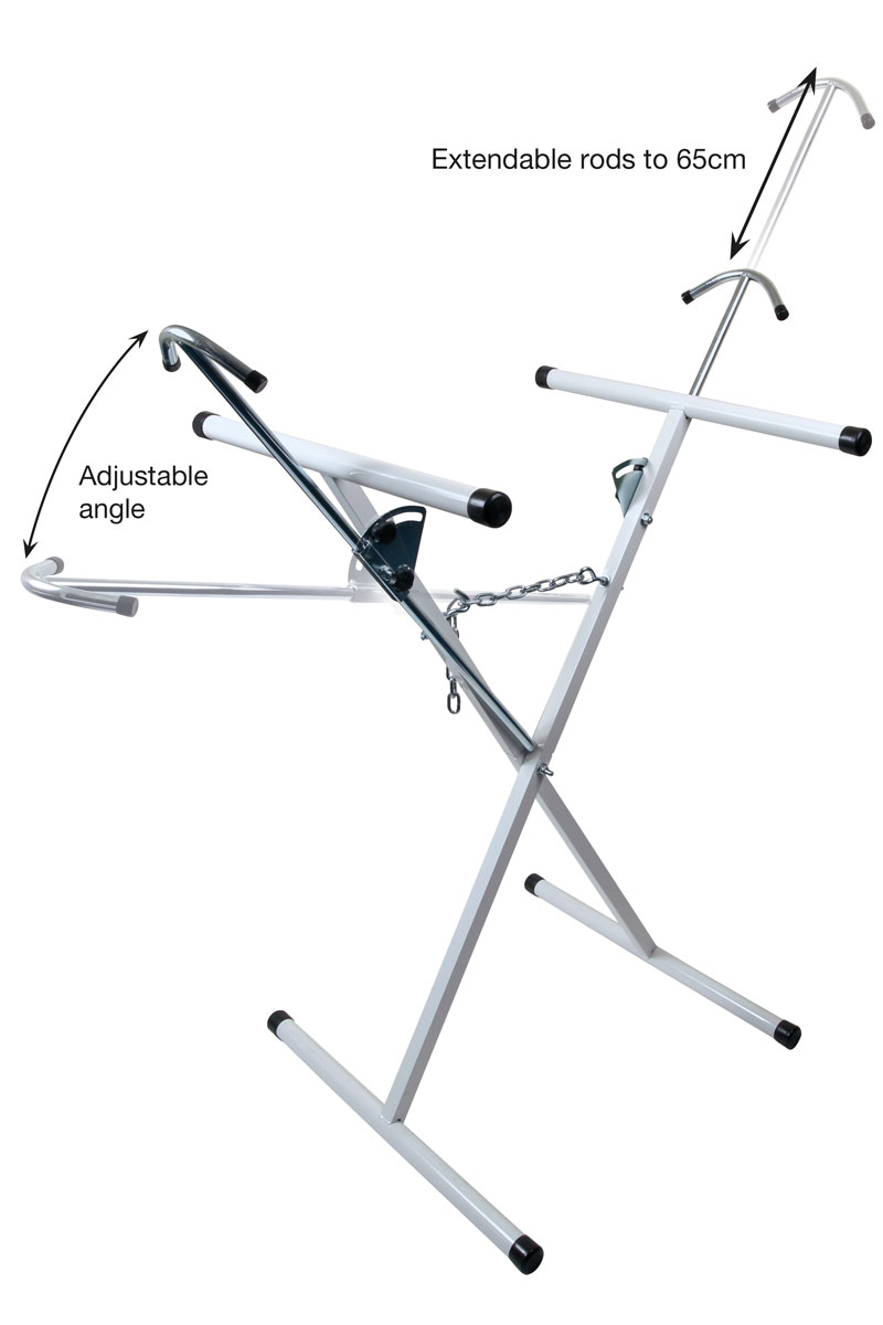 X type bumper stand, featuring adjustable extension rods to support and help keep the bumper in place. Folds away when not in use for ease of storage.