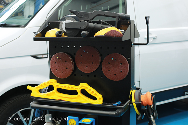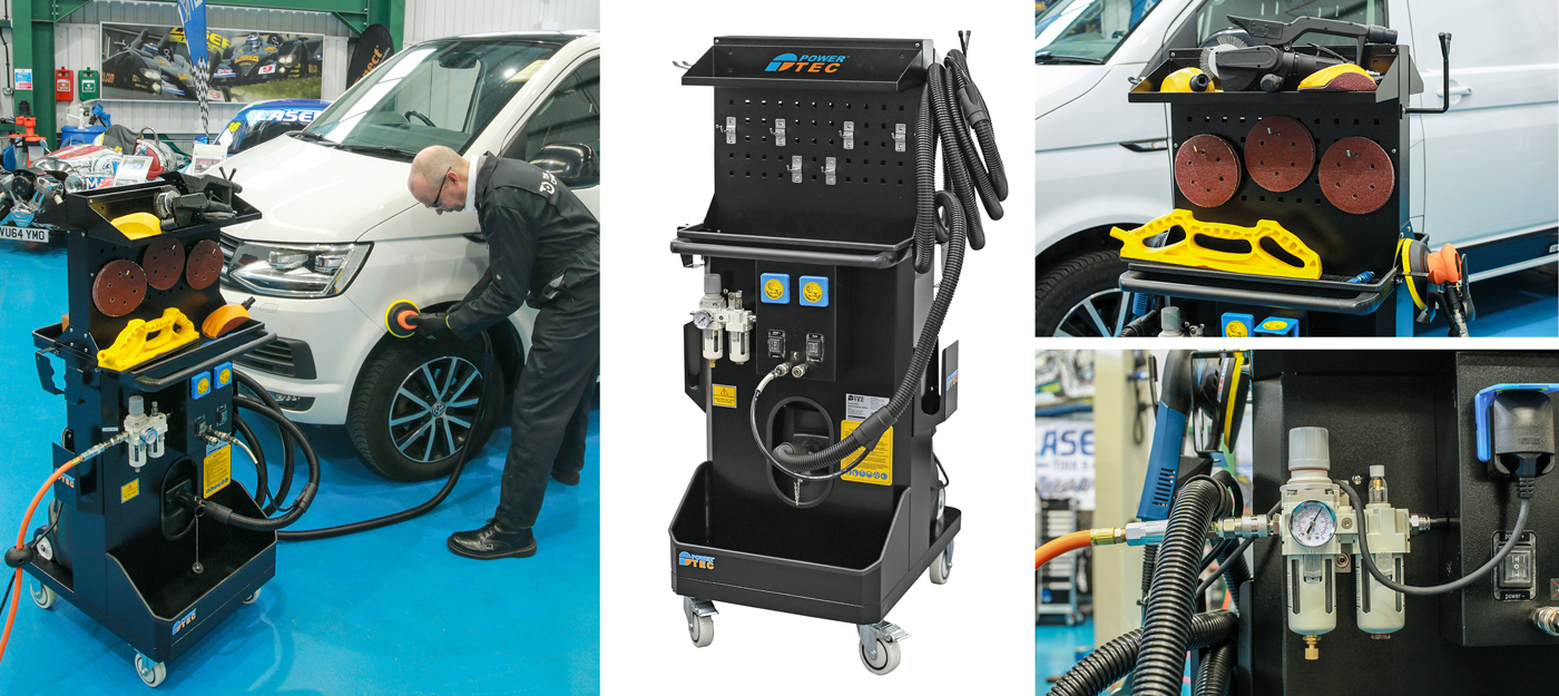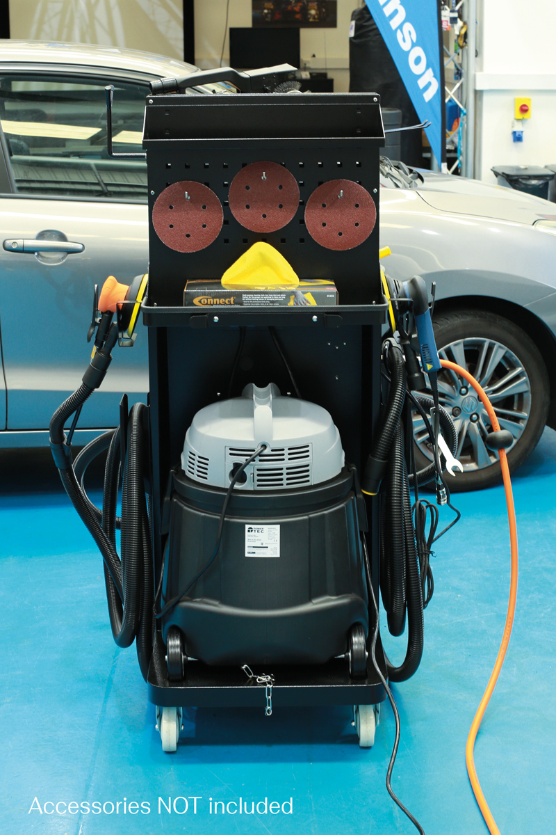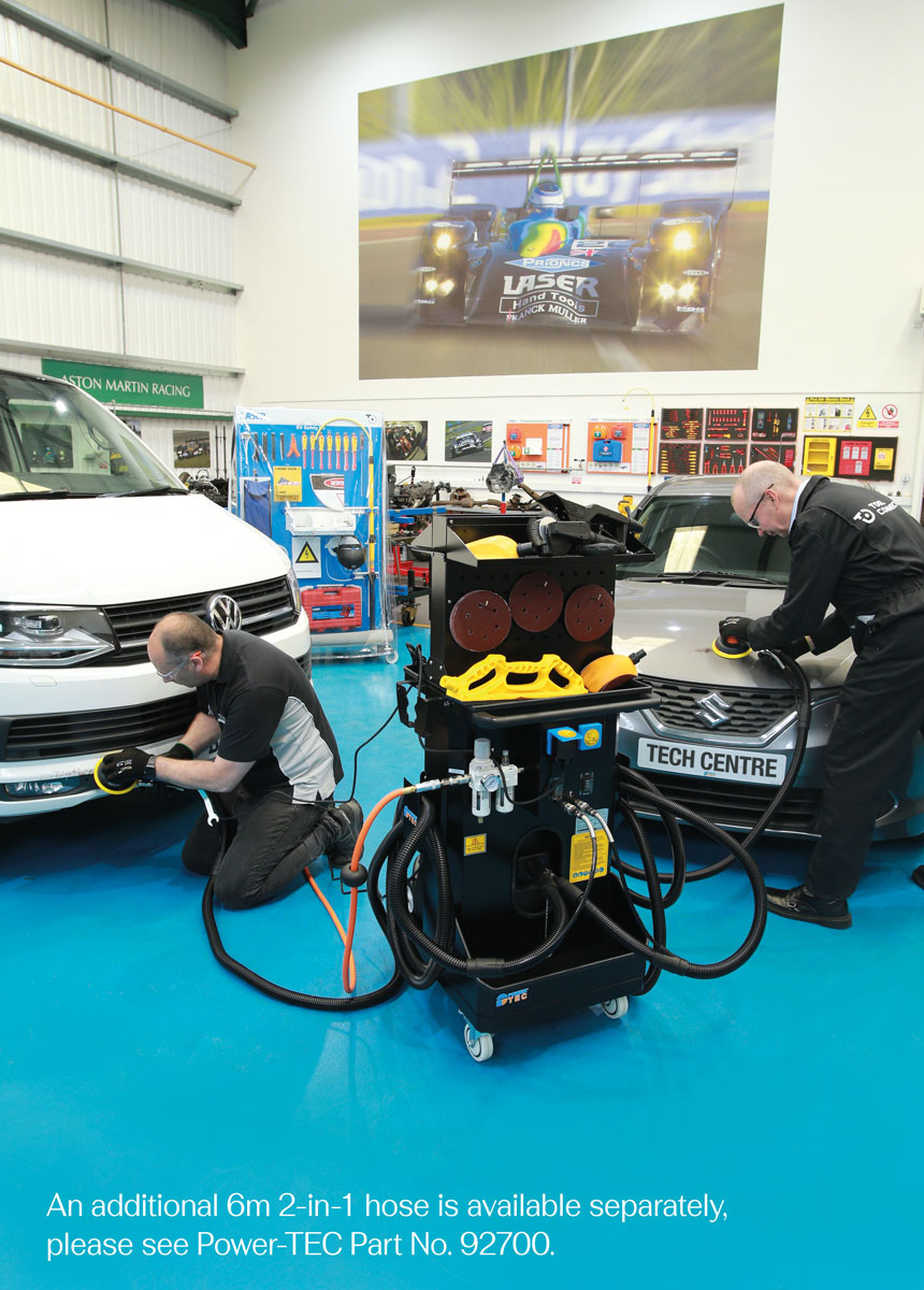 A workshop dust extraction station, based around a 1200W 55L wet and dry dust extractor, suitable for use when working with pneumatic and/or electric sanding tools fitted with a dust extraction hose connector/exhaust. The station features a built-in air control regulator with fluid level monitoring, a pair of air outlets together with a pair of 1000W 3 pin BS electrical sockets allowing for two tools to be connected and used at the same time (when used with and additional hose – Part No. 92700). The station also features shelves and hooks for stowing hoses, power cords, tools and consumables, and is fitted with four castors for easy mobility.