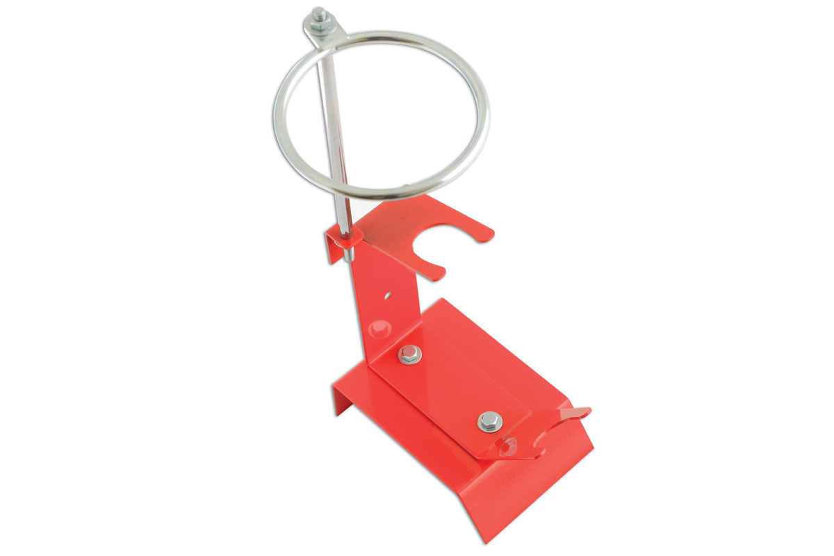 Holds spray gun and strainer so that both hands can be used to hold and steady the paint while being poured into the gun.