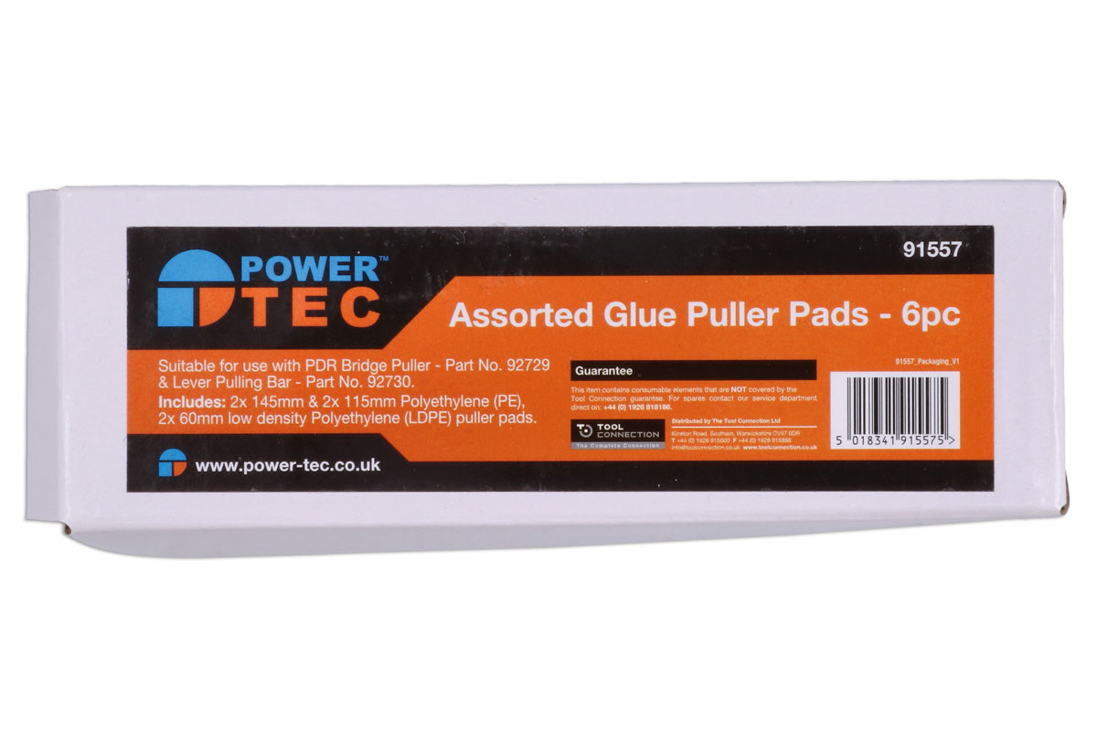 A set of 6 assorted glue puller pads designed to be used in conjunction with a dent puller and hot glue to remove dents and dings in vehicle bodywork as part of a PDR glue repair. Suitable for use with Power-TEC PDR Bridge Puller (Part No. 92729) and PDR Lever Pulling Bar (Part No. 92730).