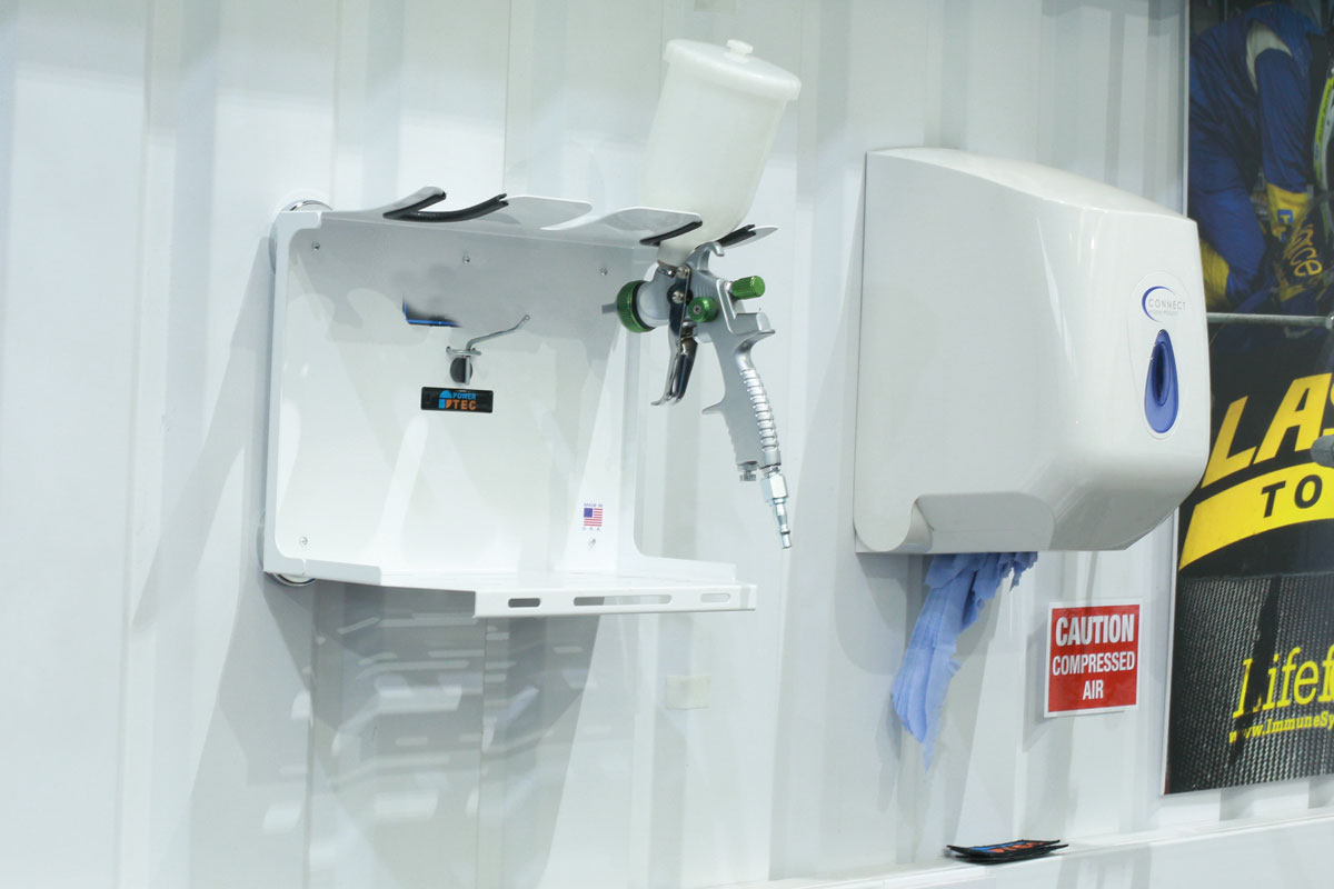 Combined spray booth shelf and spray gun hanger that uses heavy duty magnets to mount to the metal wall of the booth. Suitable for storing masking tape and other essential items close by during the painting process, it also features two soft edge spray gun hangers and one mini touch-up gun hanger.