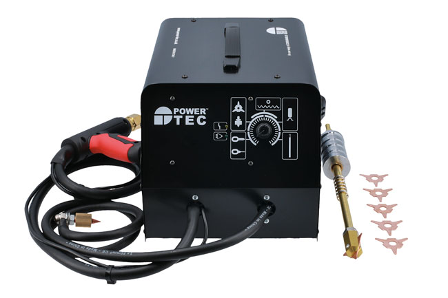 - Mains powered compact spot welder, with integral slide hammer, suitable for bodywork dent removal.