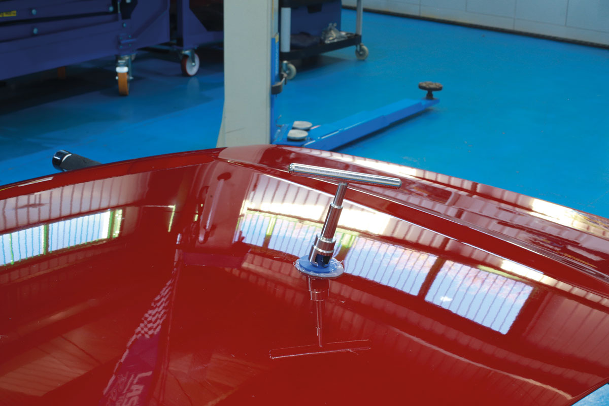 Een T-stang voor uitdeuken als onderdeel van een PDR-reparatie, om deuken in de carrosserie te verwijderen zonder schade aan de lak te veroorzaken, indien gebruikt in combinatie met hete-lijmpads/treklipjes, zoals Power-TEC Onderdeelnummer 92095.