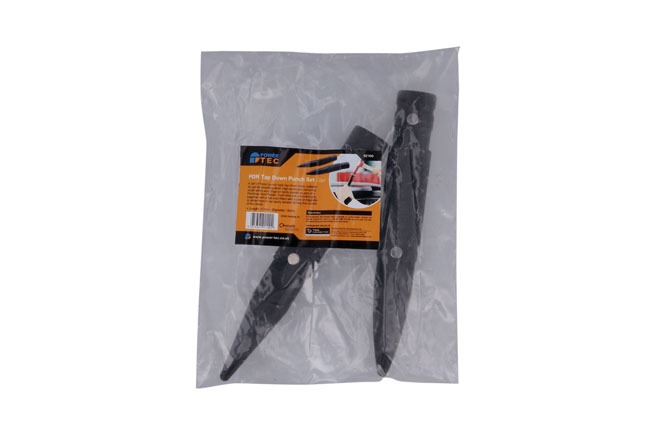 A pair of Nylon punch type tap down tools, suitable for gently knocking down high spots and removing small dents and dings on body panels as part of a Paintless Dent Repair. Each features a knurled grip, together with a flat side fitted with a pair of magnets to allow them to be easily stowed during the course of the repair.