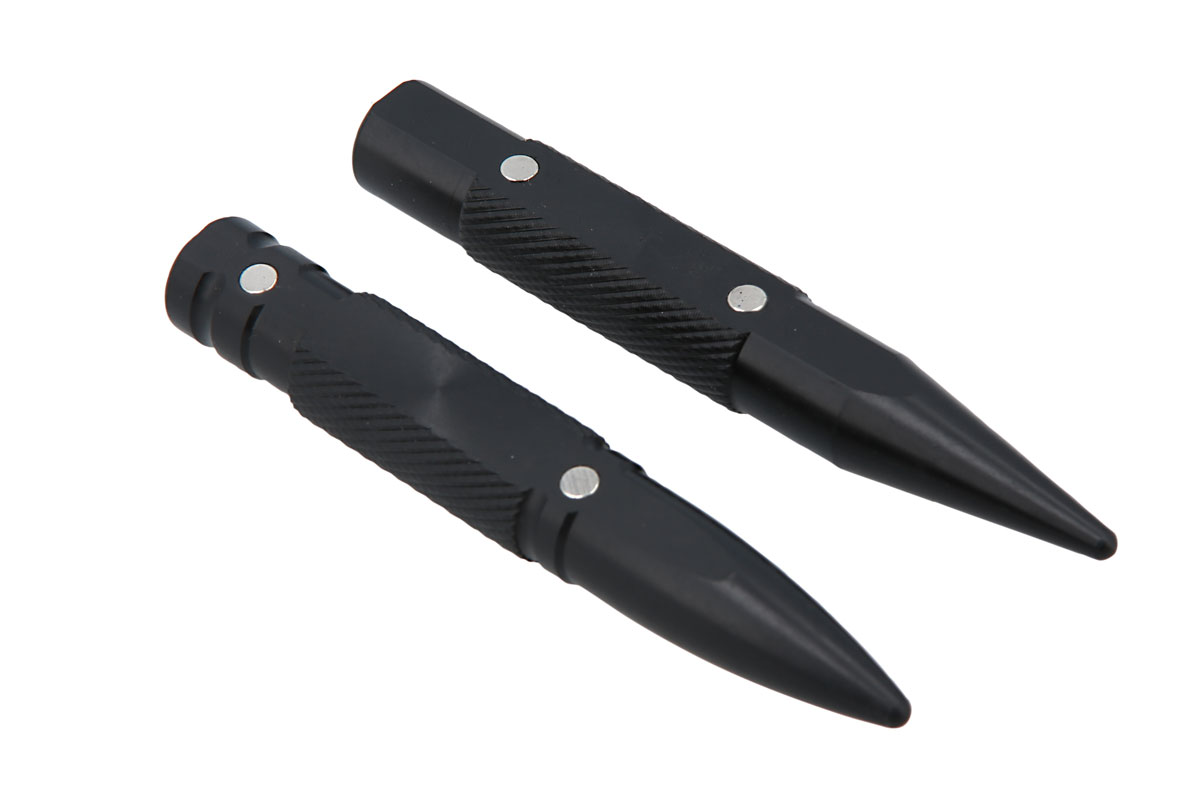 Paire d'outils en nylon de type poinçon, adaptés à l'élimination en douceur des points saillants et des bosselures légères sur les panneaux de carrosserie dans le cadre d'un débosselage sans peinture. Chaque outil est doté d'une poignée moletée et d'un côté plat équipé de deux aimants qui permet de les ranger facilement au cours de la réparation.