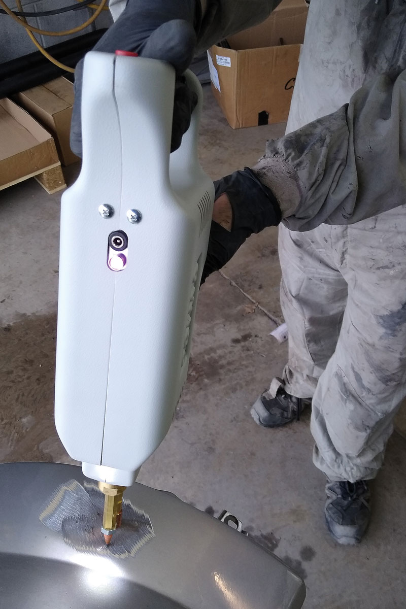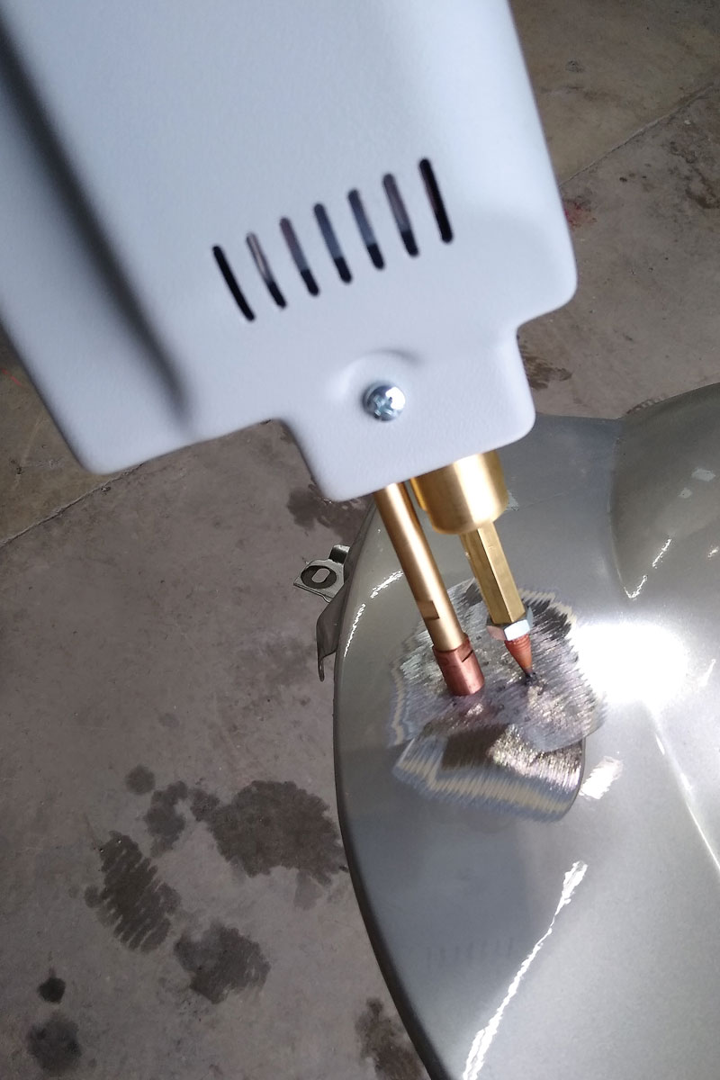 Gleithammer und Widerstandsschweißgerät in einem, und zwar kabellos; dank dieses zusätzlichen Vorteils sorgt dieses Gerät in der Karosseriewerkstatt für größte Flexibilität. Einfach auf die zu reparierende Stelle drücken, den Knopf drücken, um die Spitzen mit dem Karosserieblech zu verschweißen, und dann am Schaft zurückziehen, um die Beule mit dem Gleithammermechanismus herauszuziehen. Zum Lösen der Schweißpunkte einfach um neunzig Grad drehen. Da das Gerät die Elektroden für den Schweißstromkreislauf in einem kleinen, sehr fokussierten Bereich bereitstellt, ist es ideal für die Reparatur von Elektro- und Hybridfahrzeugen.