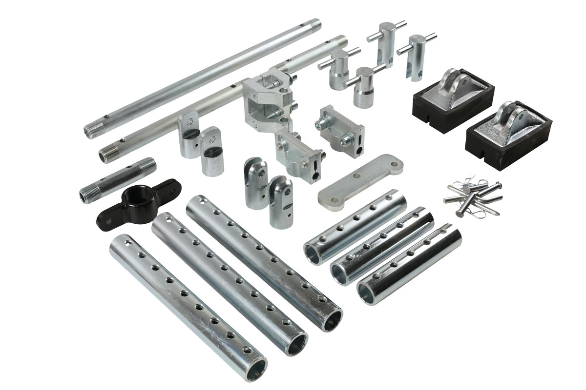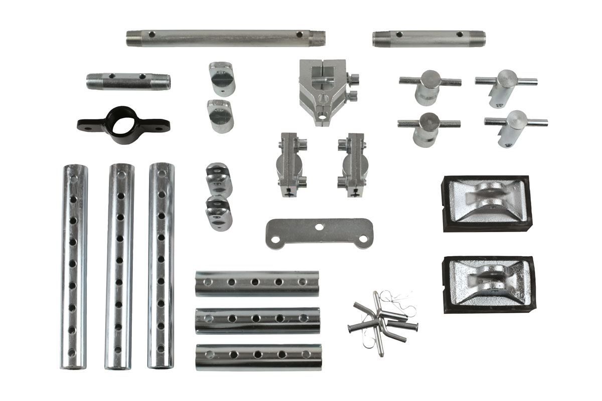 - Also includes: 2x Supports for bracket (3 hole), 2x rubber feet supports, 10x mounting pins, 10x L pins, 1x butterfly, 1x 125mm extension, 1x 170mm Extension, 1x 300mm Extension, 1x 500mm extension.