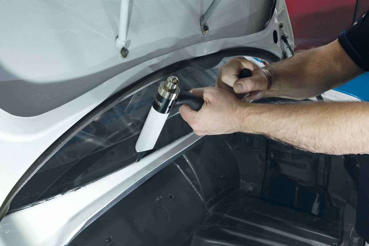 - Couteau pour colle et joints de pare-brise avec lame réglable.
