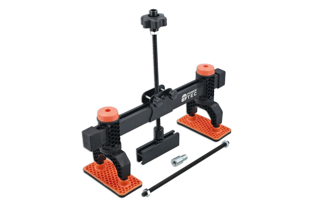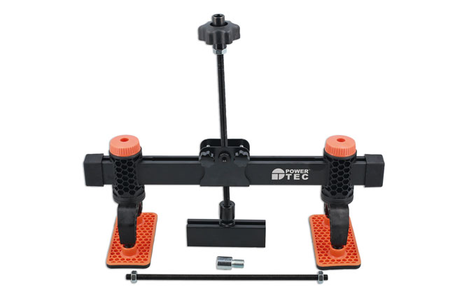 A short bridge-type dent puller, measuring 460mm in length with clearance between the working surface and the bottom of the beam of 120mm, with an adjustable hand-controlled knob lifter, for pulling dents from vehicle bodywork panels and doors. Allows for the panel to be kept under tension, allowing for the user to continue work reducing the dent tap down tools etc. Also features fully rotatable & adjustable feet (pull-plates), with 40° of movement.