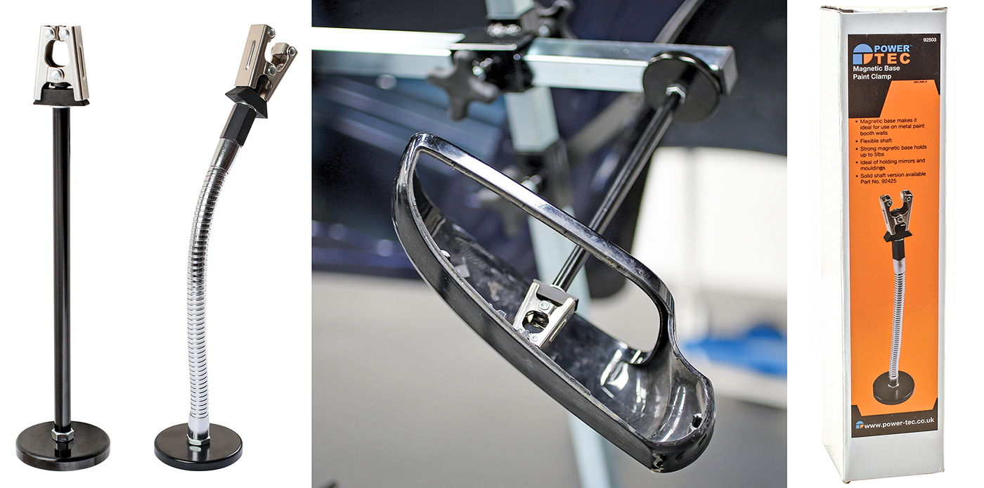 Power-TEC to the rescue! These two magnetic paint clamps are just what’s required. Part number 92425 is a sturdy, solid shaft with a clamp at one end and a powerful magnet base at the other; 92503 is similar but the shaft is flexible. The clamp will hold the component securely and they can be mounted on a panel stand for convenient spraying. For easy full-coverage on awkwardly-shaped components, they can be hand-held when spraying, then mounted on the metal spray booth wall for drying. Great for heavier components also — the powerful magnetic base is rated at 350N and they will hold up to 2.2 kg.