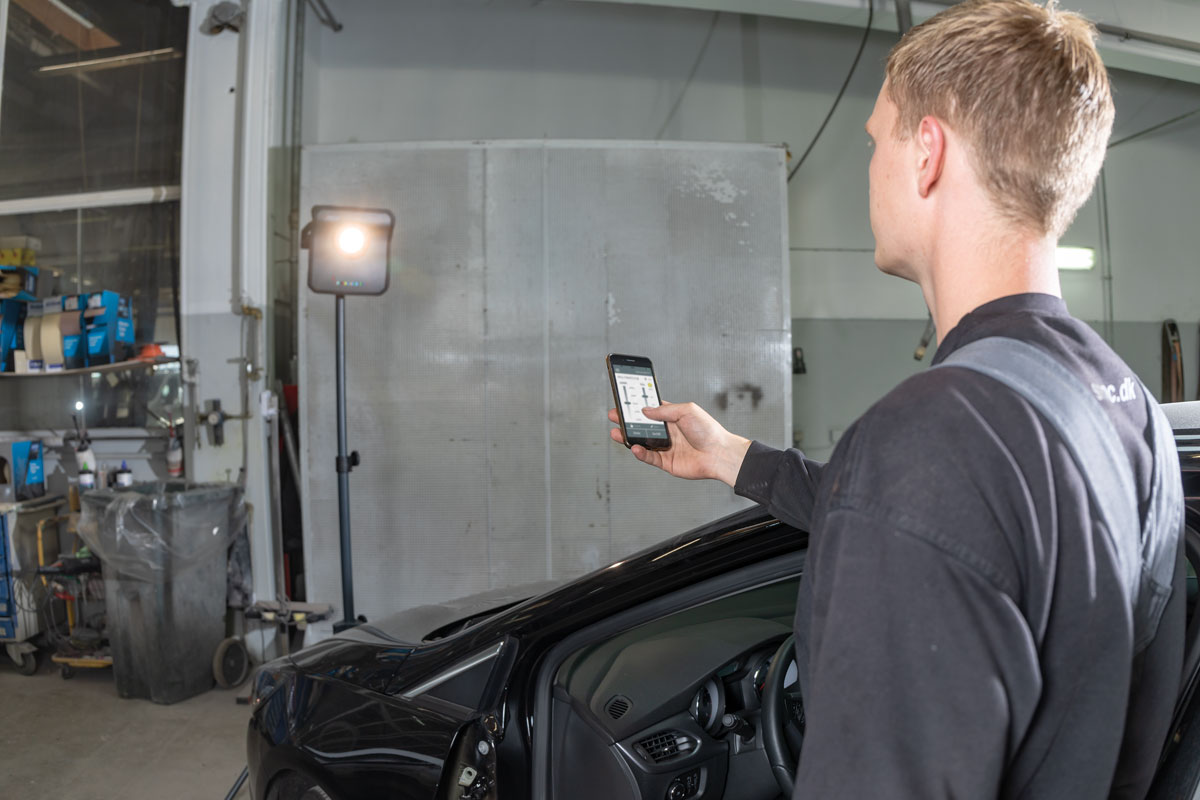 Lighting solutions for the automotive painting industry. Scangrip Colour Match lighting solutions are specially designed for the automotive painting industry, and are made for colour matching, detailing and general paint work and are usable everywhere a painted surface needs inspection. The COB (chip on board) LED technology provides a unique, uniform and completely even illumination with only one shadow which makes it particularly effective for detailing and colour matching light. The colour temperature (KELVIN) exactly fits the specific requirements for efficient work light in the automotive painting industry. The newly invented CCT SCAN functionality offers the option to scan the surface of an object with the various colour temperatures available in the interval from 2500K to 6500K. CCT SCAN functionality provides optimum conditions for the most accurate colour match and highlighting and discovering paint defects. 03.5653 Multimatch 3 LED work light with all daylight colour matching, Bluetooth & SPS solution for car detailing. Multimatch 3 is an outstanding and powerful rechargeable work light providing up to 3,000 lumens for inspection of large surfaces during polishing, painting and cleaning operations as well as for colour matching. The LED work light features the unique All Daylight function, providing you with the option to choose between 5 different colour temperatures. And the 5-step dimmer function makes it possible to adjust the light into five different levels depending on the job at hand. Features the innovative Scangrip Power Solution which provides you with unlimited availability to light. You can either insert a new fully charged battery and continue to work while another battery is charging, or you can simply add the charger directly to the LED work light to get power supply. The integrated battery backup function prevents you from being without light at any time. With the Bluetooth lighting control app, you can control and adjust both the light output and the colour temperatures, along with a range of other useful, wireless functions improving daily work efficiency.
