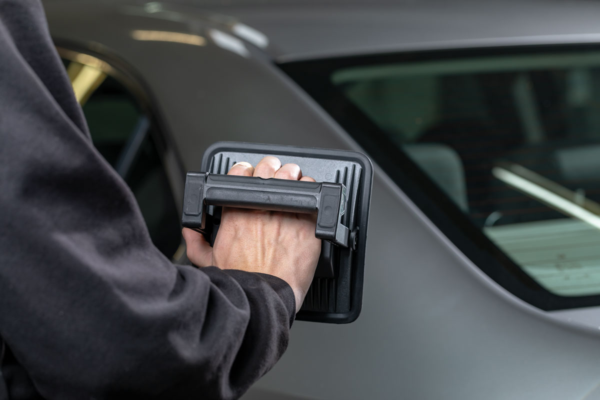Lighting solutions for the automotive painting industry. Scangrip Colour Match lighting solutions are specially designed for the automotive painting industry, and are made for colour matching, detailing and general paint work and are usable everywhere a painted surface needs inspection. The COB (chip on board) LED technology provides a unique, uniform and completely even illumination with only one shadow which makes it particularly effective for detailing and colour matching light. The colour temperature (KELVIN) exactly fits the specific requirements for efficient work light in the automotive painting industry. The newly invented CCT SCAN functionality offers the option to scan the surface of an object with the various colour temperatures available in the interval from 2500K to 6500K. CCT SCAN functionality provides optimum conditions for the most accurate colour match and highlighting and discovering paint defects. 03.5658 Multimatch R Multimatch R is a handy and powerful re-chargeable LED work light for inspection and detailing, providing up to 1,200 lumens. The Multimatch R features a unique, stepless CCT SCAN function. By activating the CCT SCAN function, the work light will automatically scan the surface of the object with the entire colour temperature spectrum ranging from 2500K to 6500K. At any point, the CCT SCAN function can be locked, and in this way, you will be able to customize the light to the specific inspection task. It is the ultimate tool for the professional detailer, providing ideal conditions for accurate colour match and highlighting and discovering imperfections. Easy to carry and ergonomically designed for a good grip on the handle, which is also equipped with powerful integrated magnets for flexible mounting. Highly flexible application possibilities for internal inspection of cars and other narrow areas. The work light is designed for direct mounting on the Scangrip Wheel Stand, Part No. 03.5682. By using the Scangrip Wheel Stand, Multimatch R can be mounted on the lower bracket as a second light to illuminate from below. This dual light option provides perfect, shadow free illumination from the upper side as well as from the underside when working on the side of the car.
