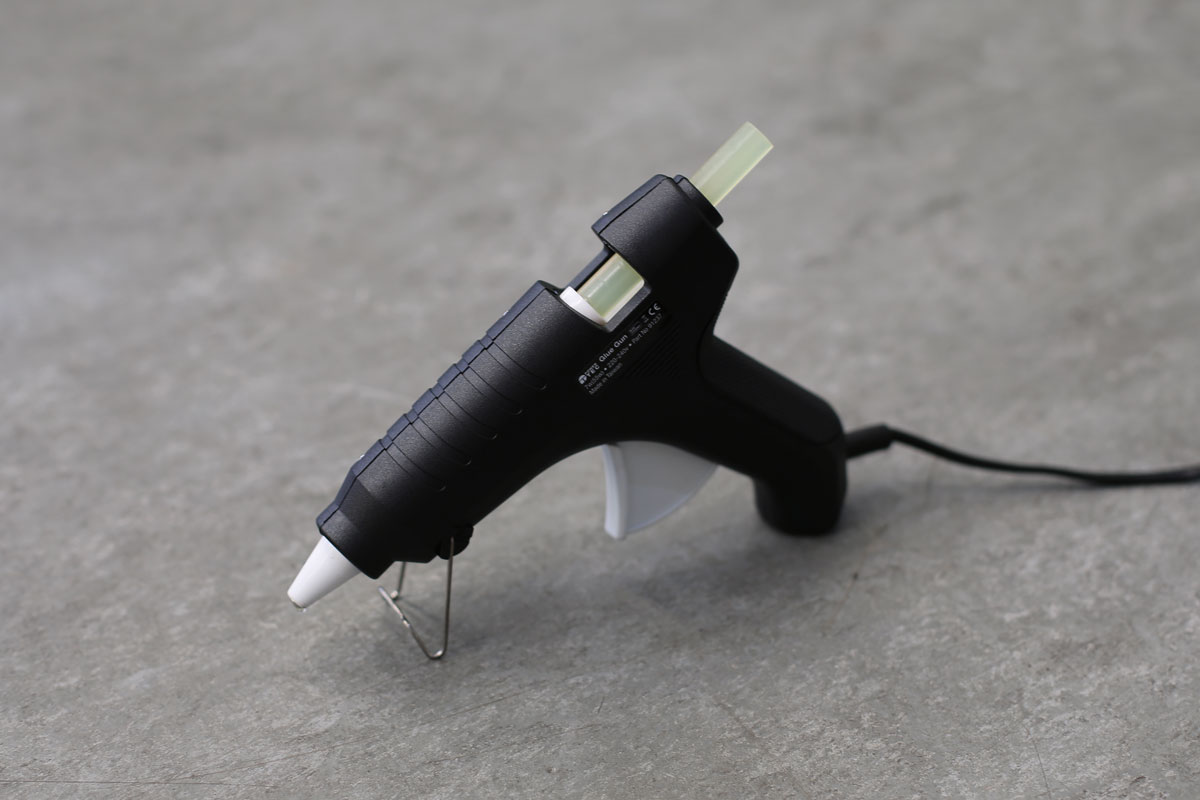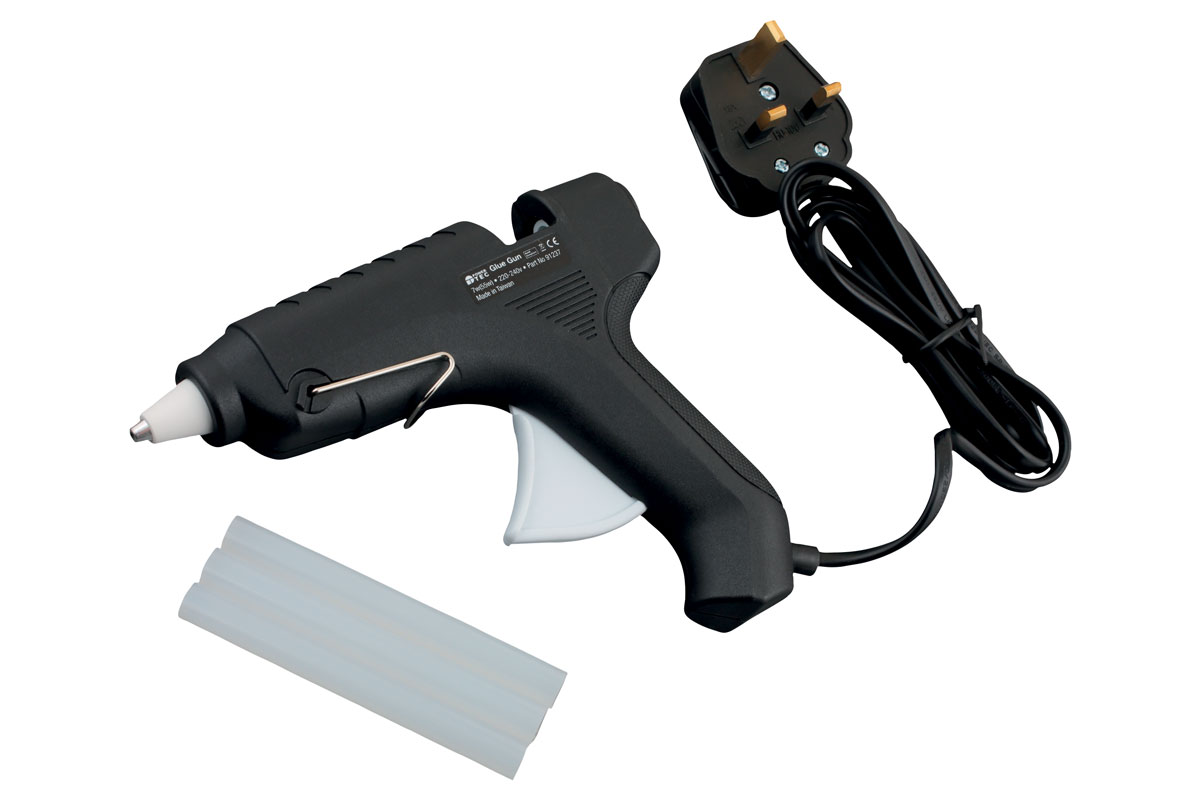 Hot melt glue gun with quick and easy glue stick feeder, for precision controlled glue application. Supplied with 3x glue sticks.