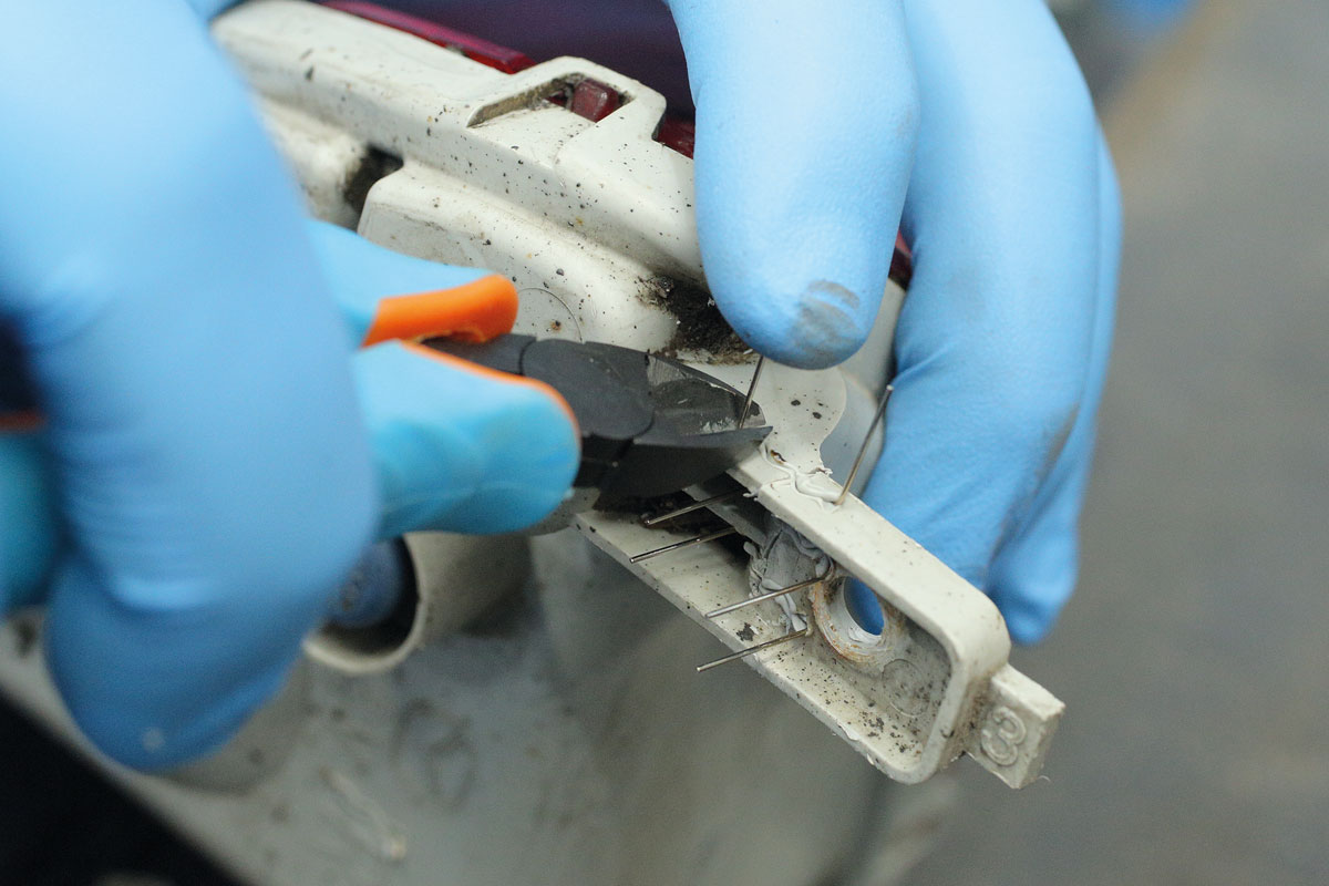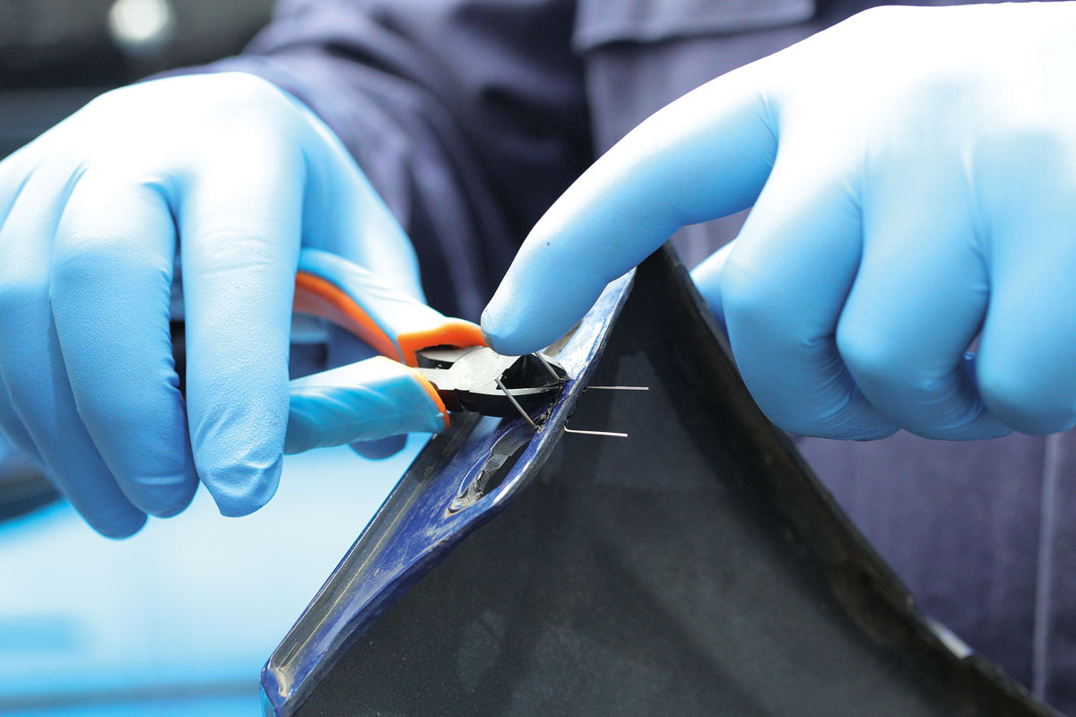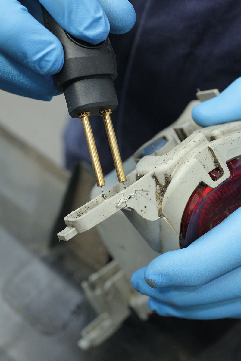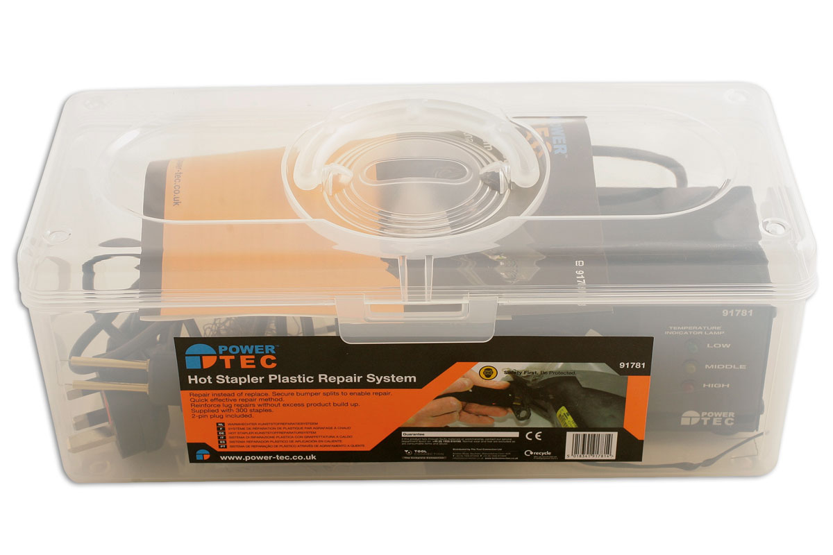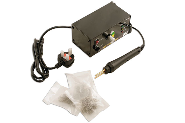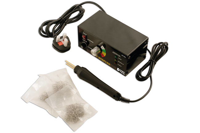 Hot stapler repair system, ideal for repairing plastic parts and components such as bumpers and headlamp housings. Safety Warning: Wear safety goggles when cutting staples.