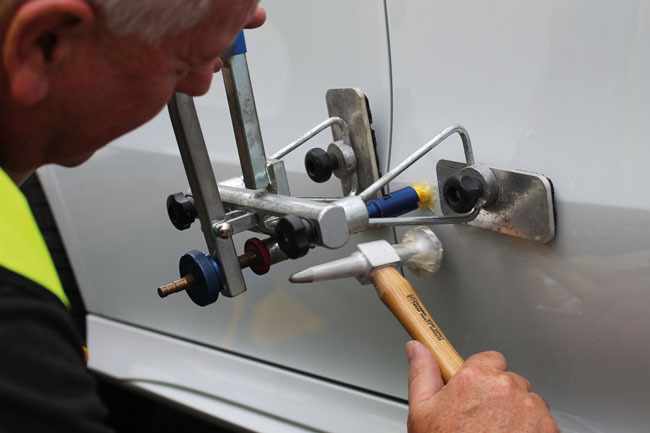 Hand-operated dent puller, ideal for removing smaller dents with ease and control. Suitable for use with hot melt glue gun.