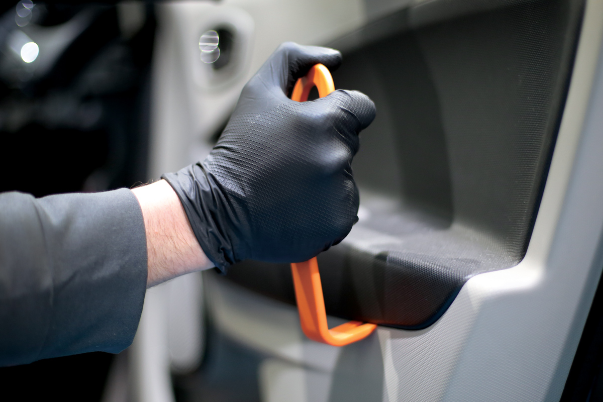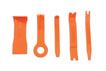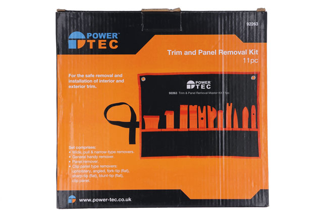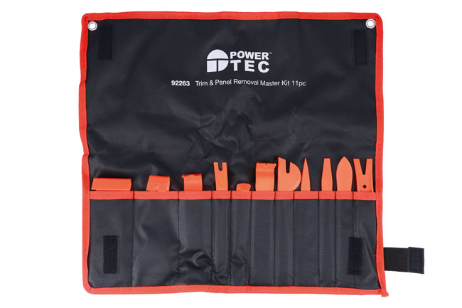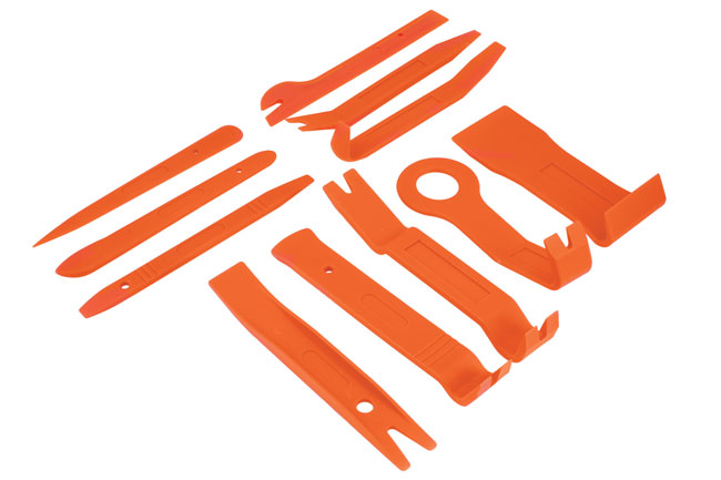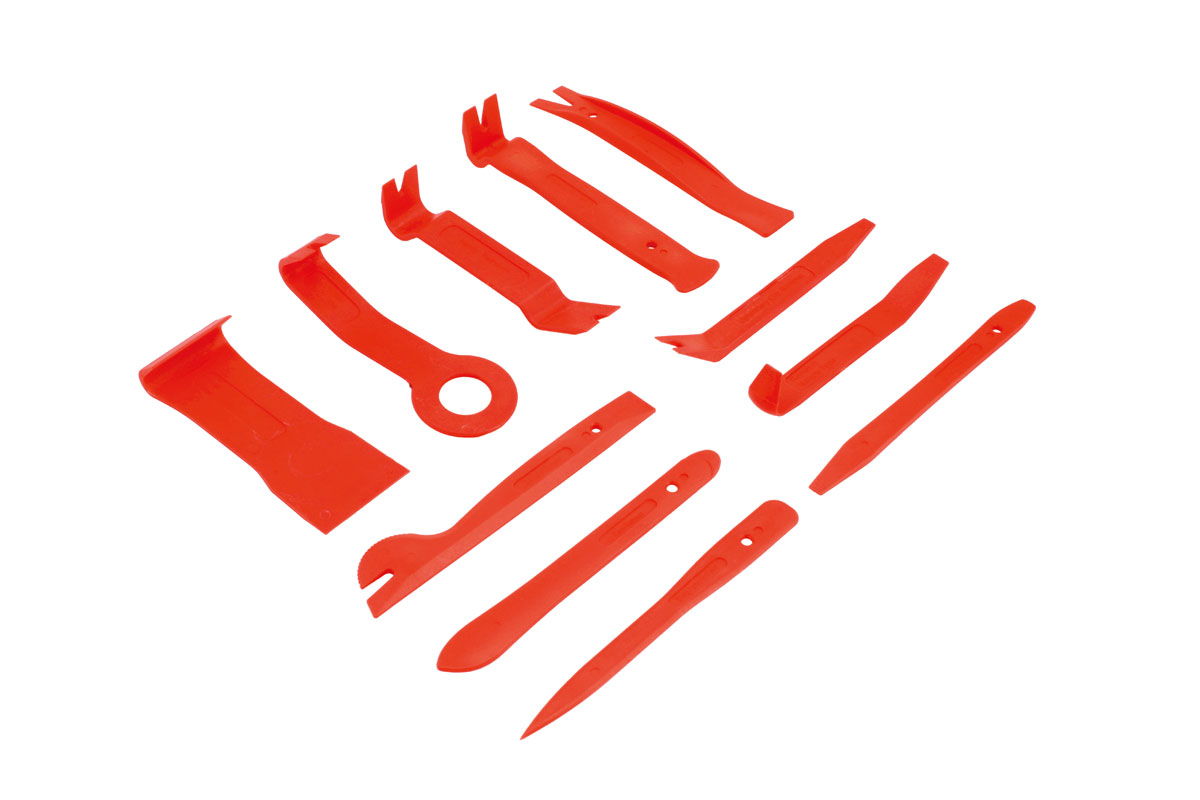 A comprehensive set of 11 impact resistant trim tools for the safe removal and installation of interior and exterior trim, door panels, dash and upholstery panels, body mouldings and emblems. The set includes an adhesive weight remover with a cutting edge for wheels.