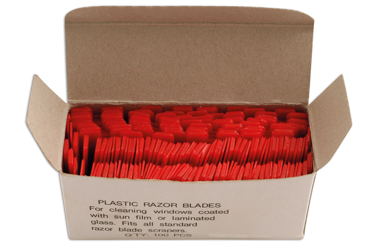 A pack of 100 single edged, plastic razor blades. Ideal for use with a razor scraper. Suitable for removing pinstripes, stickers, bugs, tar and adhesive etc.