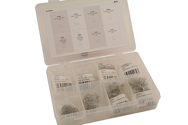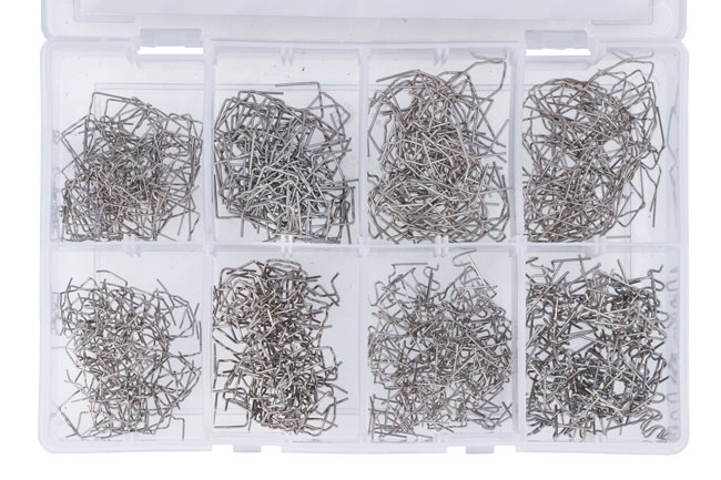 An assorted collection of U, V & W shaped staples for use as part of a plastic repair with a hot stapler system.