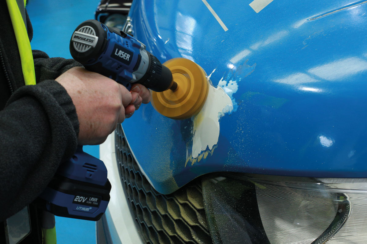 Adhesive and tape left on a panel can be difficult to remove. The fluted Stripe Off eraser wheel will remove this in seconds, and the adhesive is removed without damaging the paintwork. Stubborn cracked and hardened vinyls that won’t simply peel off are also not a problem. Old pin stripes that are hard and UV damaged will usually just break off into little pieces and be very difficult and frustrating to remove; the Stripe-off eraser wheel is mounted in a drill (air powered or electric), and taking care and only applying gentle pressure, the tape and adhesive is whisked away. It really has to be seen to be believed!