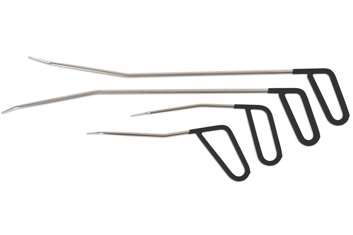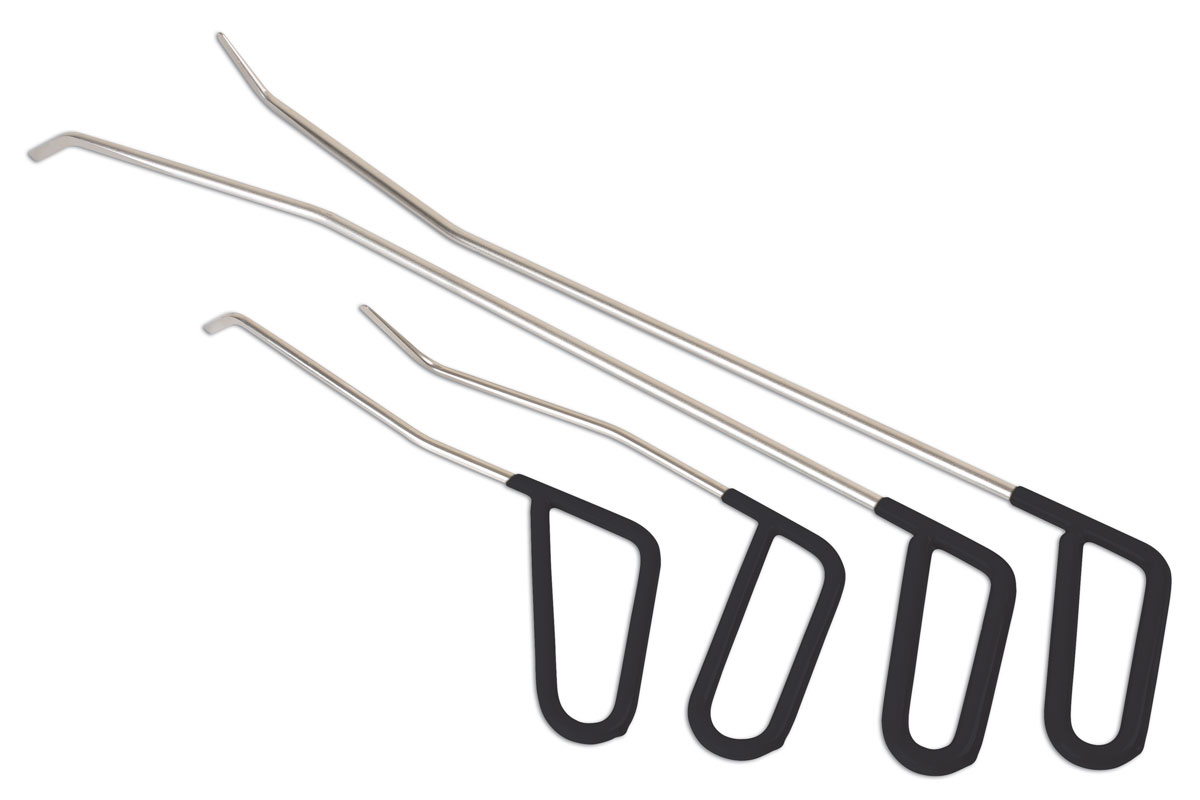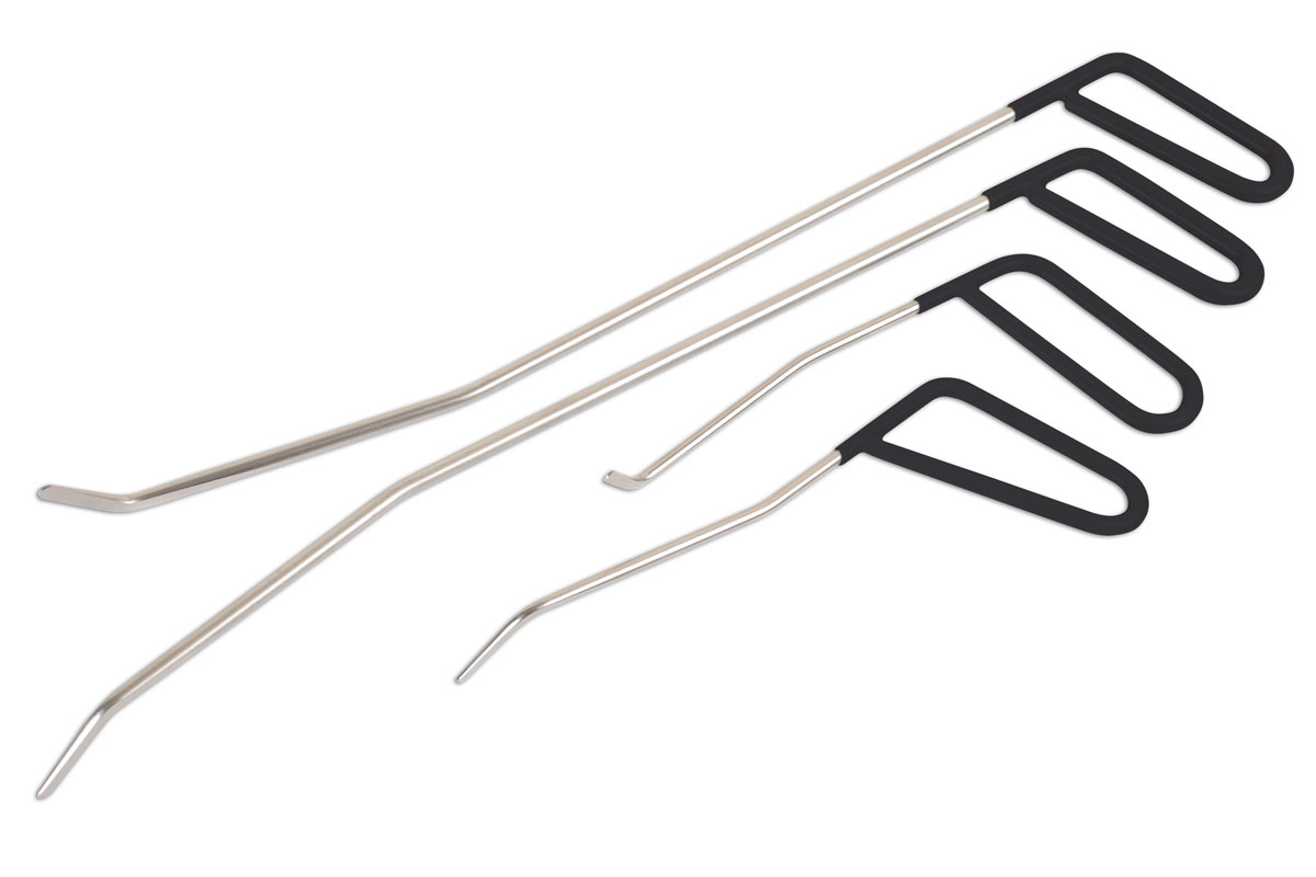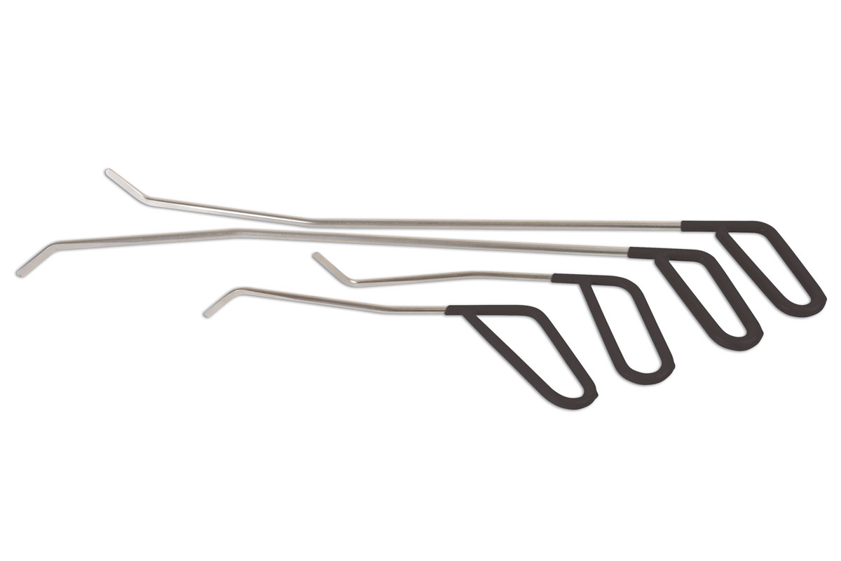 A set of specialist PDR door panel tools to access to the rear of the dent by sliding uniquely designed bars through the gap between the glass and the weather strip along the door top.
