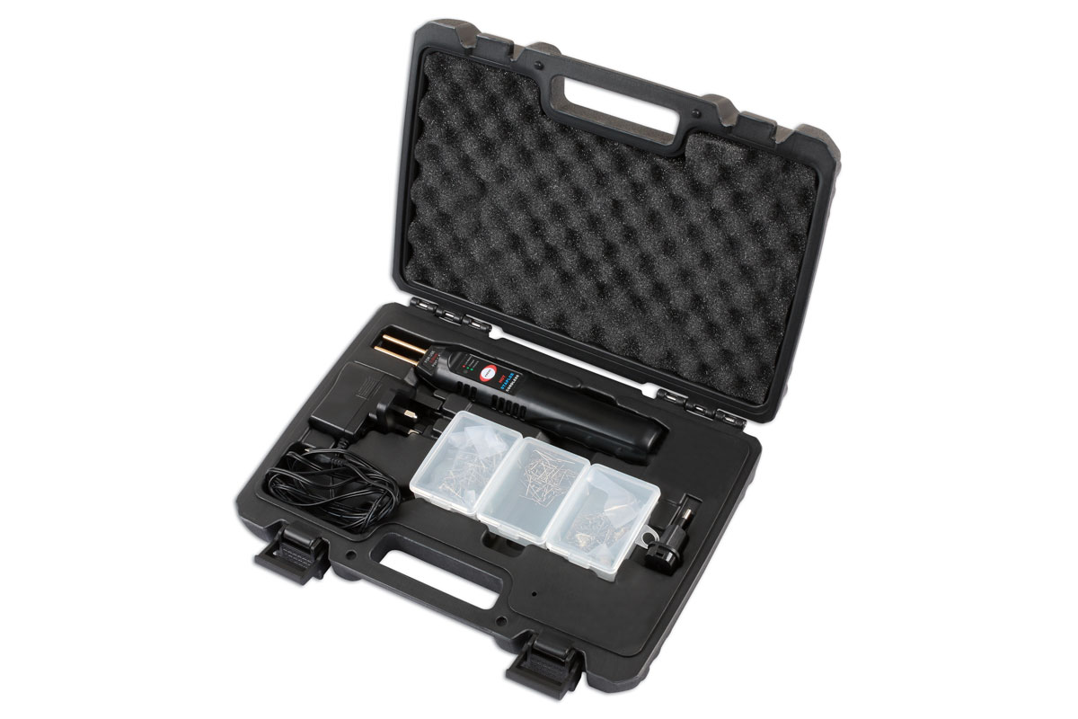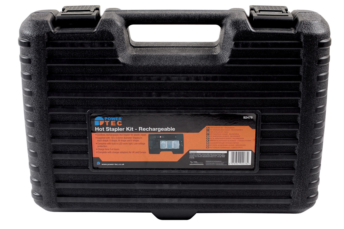 Rechargeable cordless hot stapler kit, complete with staples, UK and Euro plug for plastic repair. Ideal for use on bumpers and headlamp housings etc.