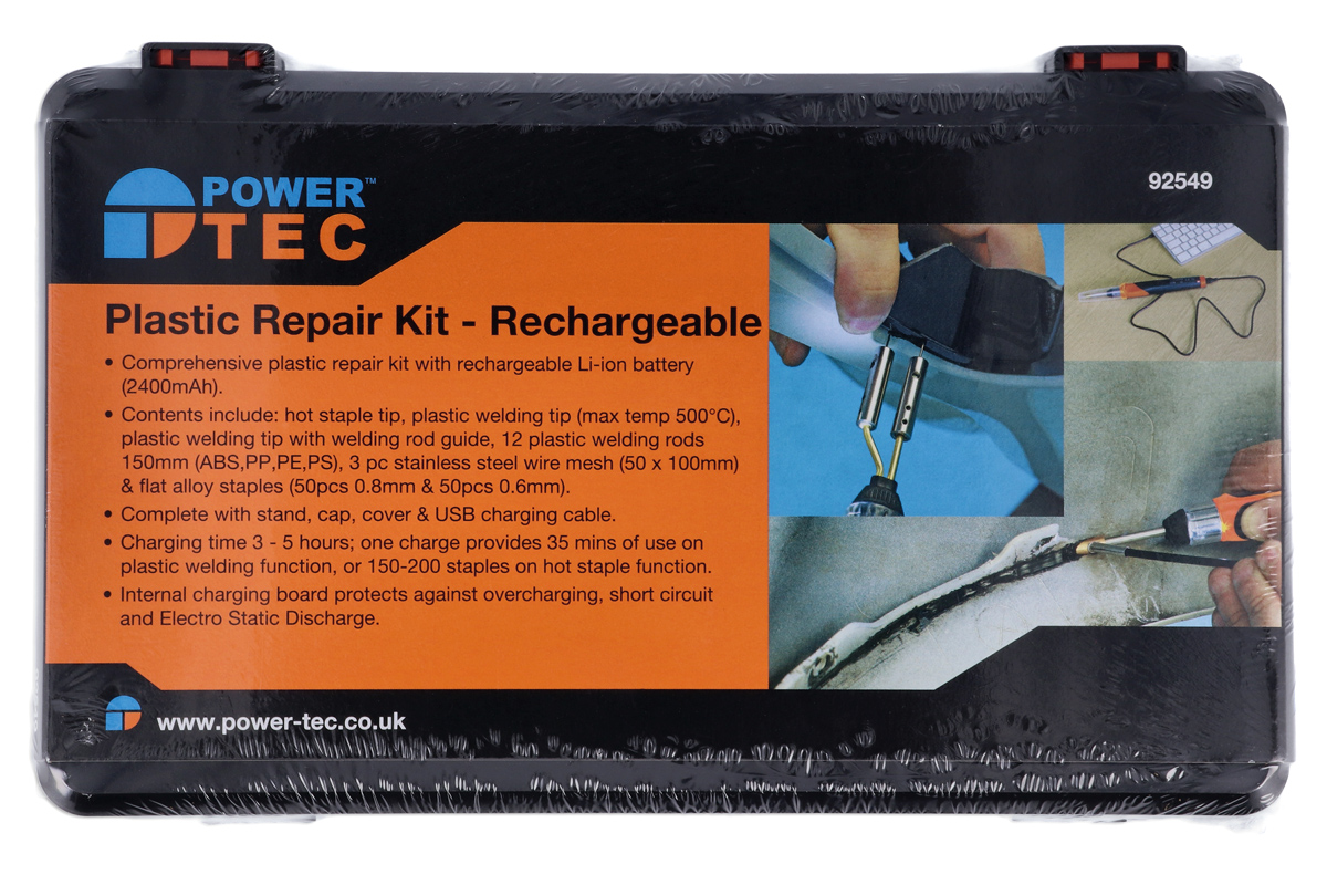 - Comprehensive plastic repair kit with rechargeable Li-ion battery (2400mAh).