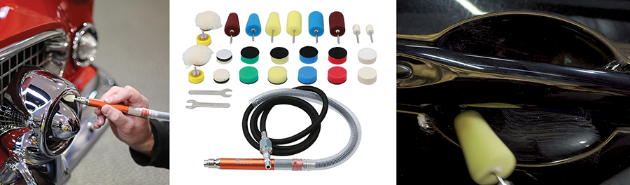 A 29 piece, lightweight pneumatic detail polishing kit, for buffing & polishing intricate areas on any vehicle to achieve a rich, swirl free, high gloss finish.