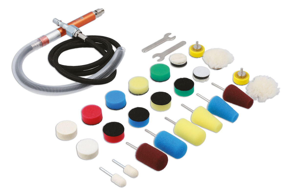 Ein 29-teiliges, leichtes Druckluft-Feinpolierset zum Hochglanz- und Feinpolieren schwer zugänglicher Flächen an jedem Fahrzeug für eine intensiv glänzende Oberfläche ohne Schleifspuren.