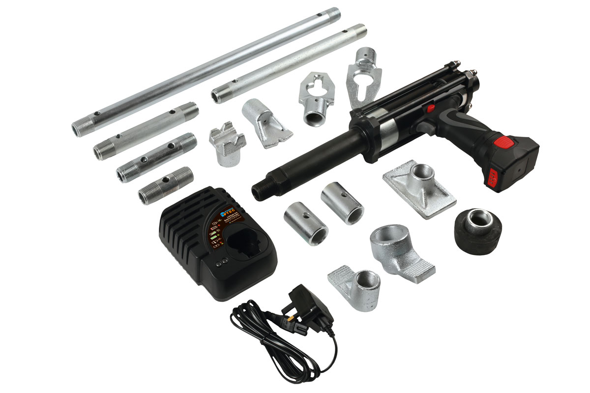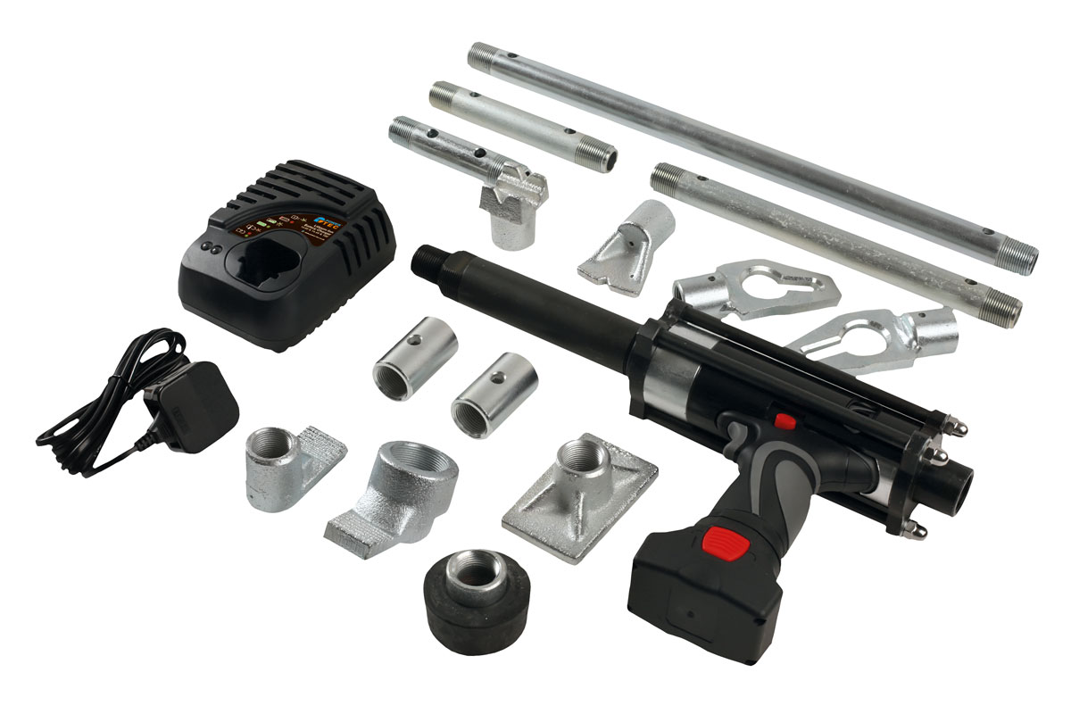 • Kit includes battery powered ram, 1 x Li-ion 14.4V 2.0Ah Battery, battery charger, 6 x extension tubes & bars, 7 assorted push pull attachments including 1 chain lock attachment.
