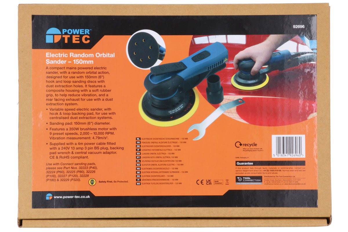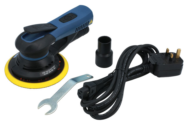 A compact mains powered electric sander, with a random orbital action, designed for use with 150mm (6”) hook and loop sanding discs with dust extraction holes. It features a composite housing with a soft rubber grip, to help reduce vibration, and a rear facing exhaust for use with a dust extraction system. The 9-stage variable speed motor ranges from 2,000 to 10,000 RPM and features a soft start function to prevent gouging the work surface, a downforce overload indicator, and a temperature monitor which can shut the sander down to prevent it from overheating.