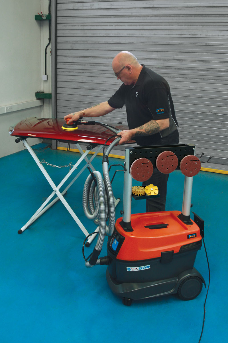A portable industrial dry vacuum cleaner designed for use as a dust extractor when working with pneumatic and/or electric sanding tools etc. It features a 38L waste drum, a workshop air inlet and 2-in-1 hose for use with air powered tools, together with a 3 pin BS electrical socket with a 1000W output for use with power tools. It can be switched between an automatic mode, which turns the vacuum on when the connected tool is being used and switches off 5 to 10 seconds after the tool has stopped running, and a manual mode where the vacuum runs continuously.