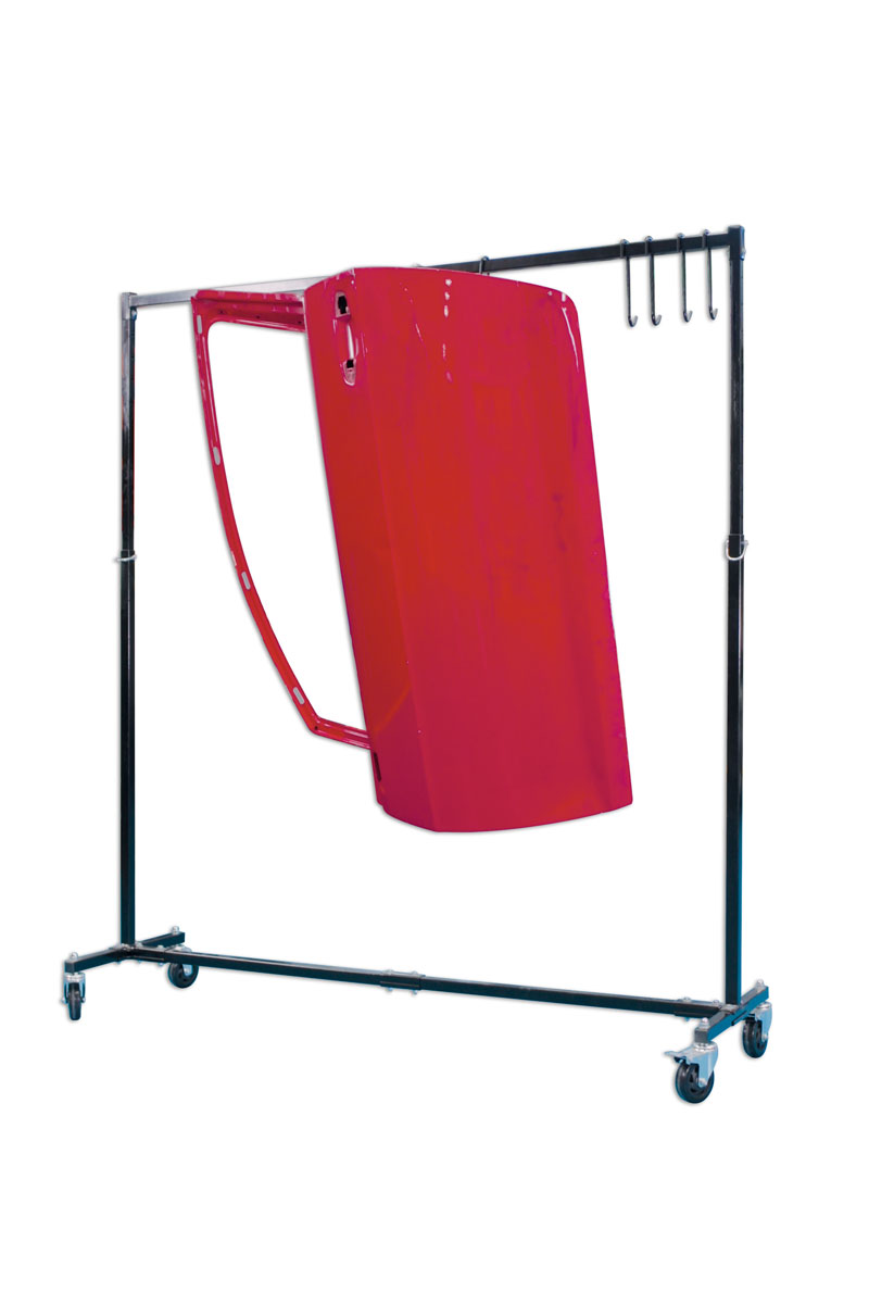 An adjustable frame for hanging parts such as wing mirrors, bumpers, doors, bonnets, during the painting and drying process. The frame can be extended to its maximum height 2 metres, and it features four swivel castor wheels making it easy to manoeuvre around the bodyshop and spray booth.