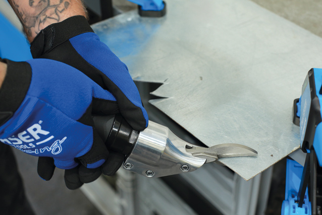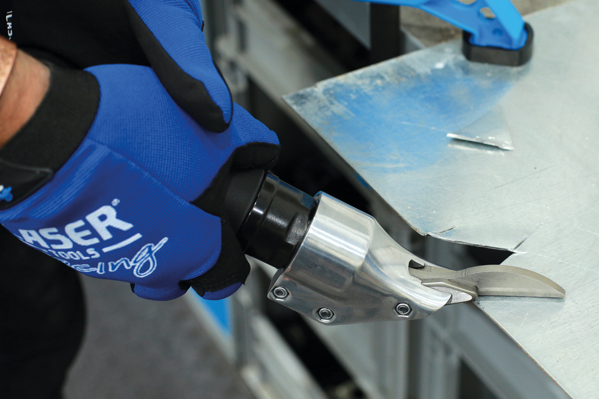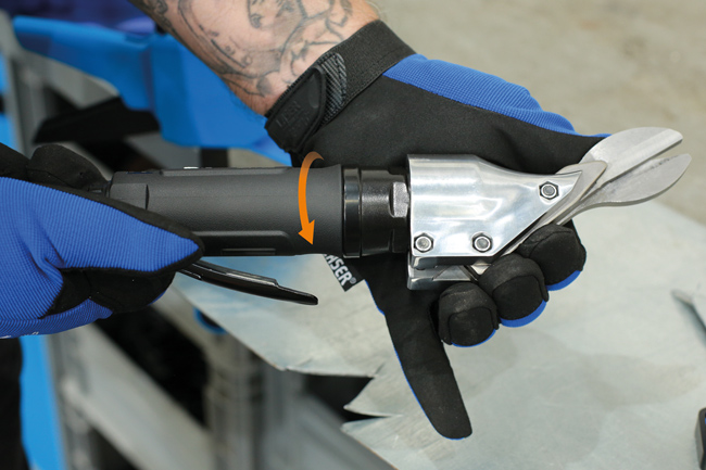 - Schneidbacken aus rostfreiem Stahl. Die Scherenfunktion reduziert den normalerweise bei pneumatischen Scheren oder Nibblern anfallenden Verschnitt.