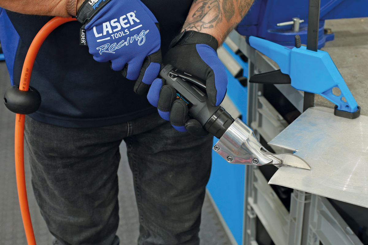Designed for professional panel work fabrication and bodywork repairs, the new Power-TEC pneumatic air scissors (part number 92717), combine ease of use with superb performance. Powered by the workshop compressed air supply, these tin snips deliver precise and controlled cuts in steel and aluminium sheet. With traditional snips you are providing the cutting power by hand as well as attempting to accurately cut the pattern. With the air-powered version, you’ll glide through the material (cuts steel sheet up to 1.2mm thick, aluminium sheet up to 1.6mm thick), and easily and accurately follow the cutting line or pattern. This makes them an indispensable tool for body shops and fabricators.